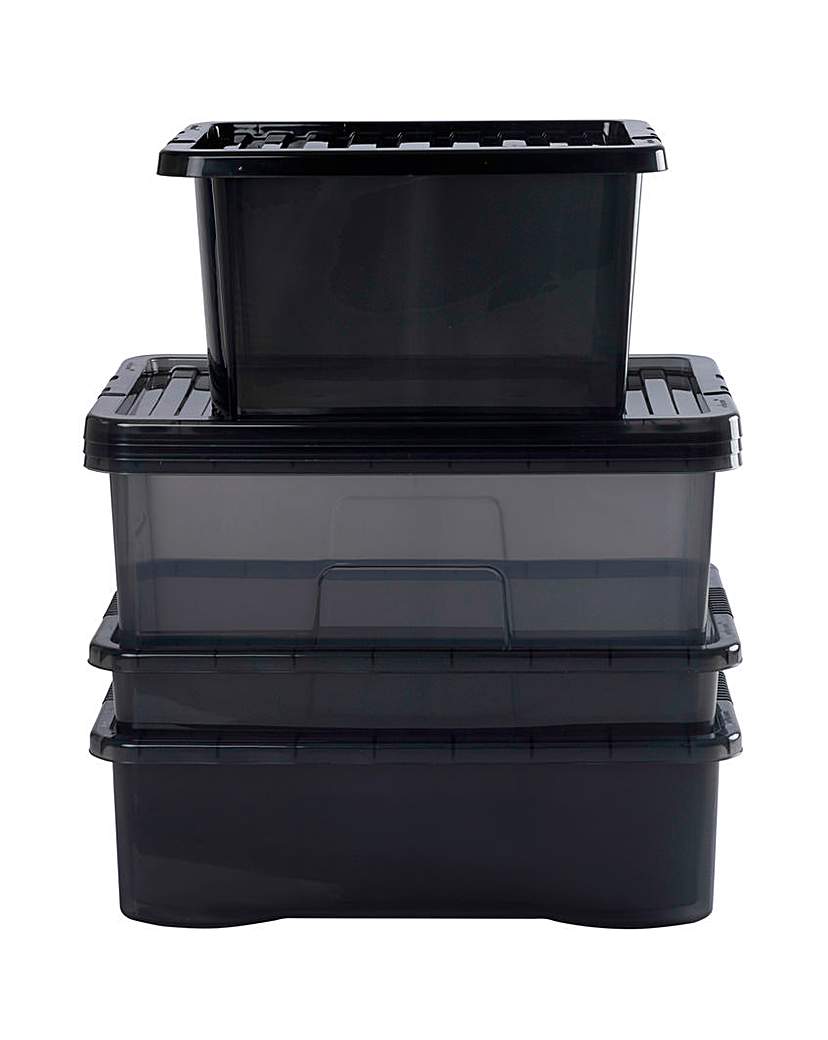Ideal for home storage, these high-quality boxes with clip on the lids are suitable for all around the home and workplace. Translucent Tint Smoke base/lid to easily view contents. Boxes are stackable when in use and nest when not. Made in UK. Contains: 1x 28Ltr, 1x 32Ltr, 1x 45Ltr, 1x 80Ltr Boxes & Lids