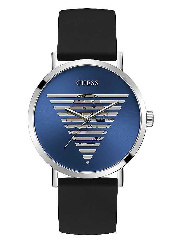 A true style icon, with cut thru triangle design that shows its movement and a sleek smooth silicone strap. Brand: Guess Water resistant: 30 Meters A true style icon, with cut thru triangle design It shows its movement & a sleek smooth silicone strap