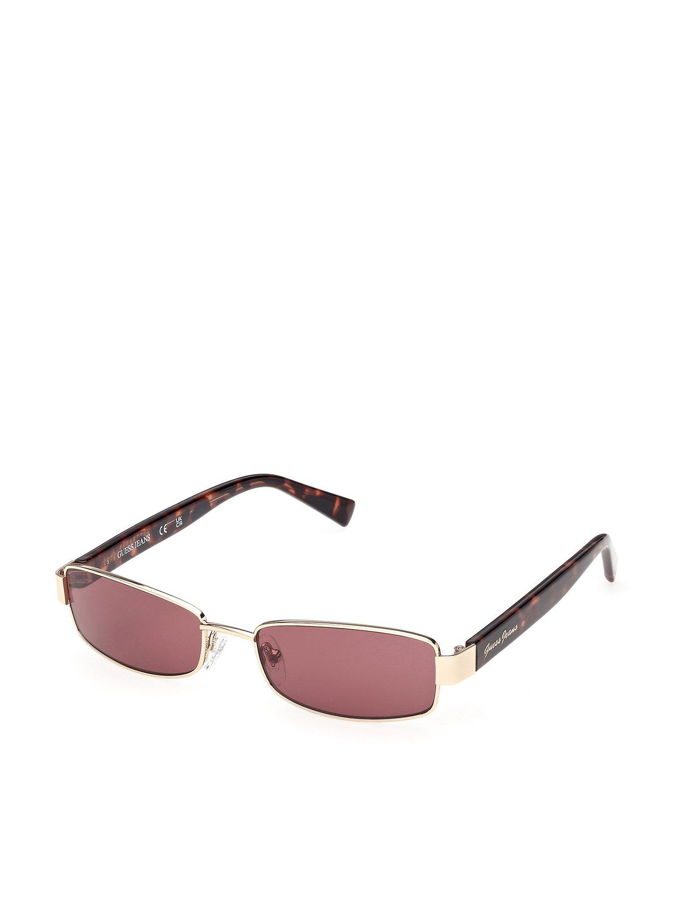 Guess Jeans Rectangular Metal Sunglasses Size & Fit One Size Details Rectangular Metal Sunglasses by Guess Jeans Gold Rectangle frame Coloured lens Branded arm detail Single bridge with adjustable silicone nose pads Material & Care Material Content: METAL SUNGLASSES Washing Instructions: Wipe Clean