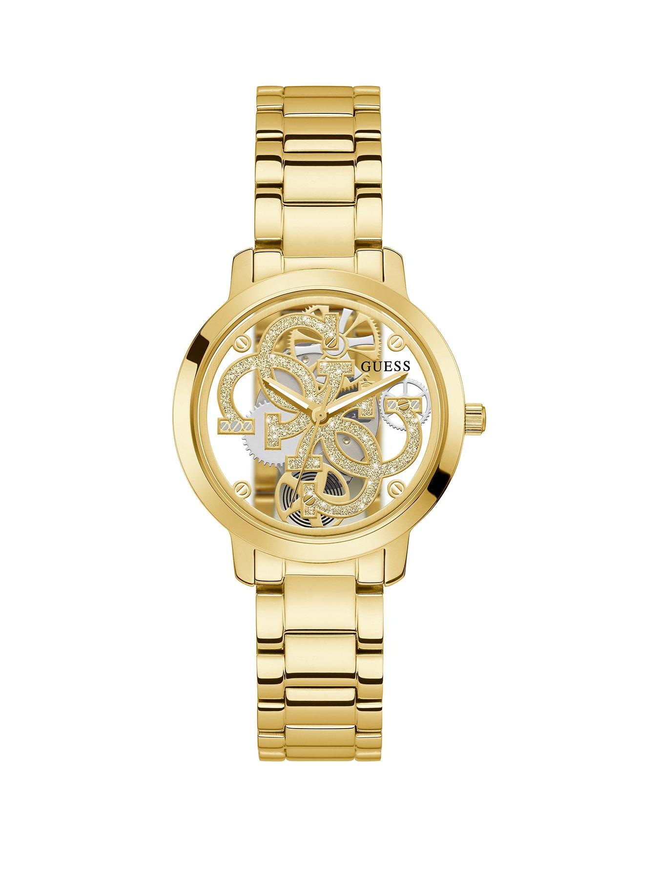 Guess Quattro Clear Stainless Steel Ladies Watch Polished gold case, chanpayne see through logi dial and polished gold bracelet 24Hr Display: N Case Diameter (in cm): 36 Case Shape: Round Glass: Mineral Strap Material: Stainless Steel Water Resistant: Y swilliams@Timex.com