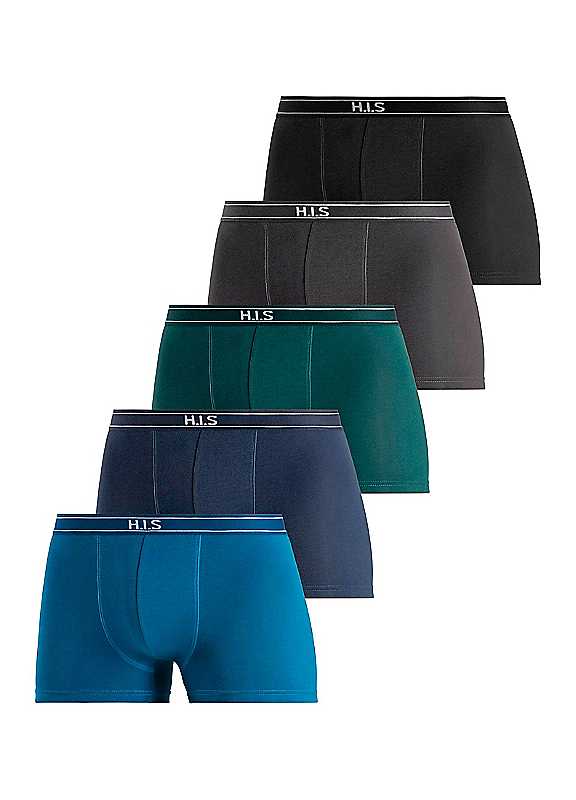 Stylish pack of 5 boxer shorts by H.I.S. They feature a woven waistband with stripe and logo detail for comfort and style. Made from a comfortable stretch cotton. Brand: H.I.S Pack of 5 Logo woven waistband Colour Mix 1: Black, Black/Anthracite, Black/Navy, Black/Red, Black/Grey Colour Mix 2: Blue, Mint, Navy, Anthracite, Black Colour Mix 3: x Black, 2 x Navy Colour Mix 4: Purple, Blue, Green, Yellow, Orange Colour Mix 5: Black/Purple, Black/Blue, Black/Green, Black/Yellow, Black/Orange Machine wash 95% Cotton, 5% Elastane | mens boxer shorts black, underwear with logo, boxers set, boxer trunks, tight boxer shorts, cotton knit boxer shorts, mens stretch boxers, mens trunks 5 pack, boxer shorts multipack