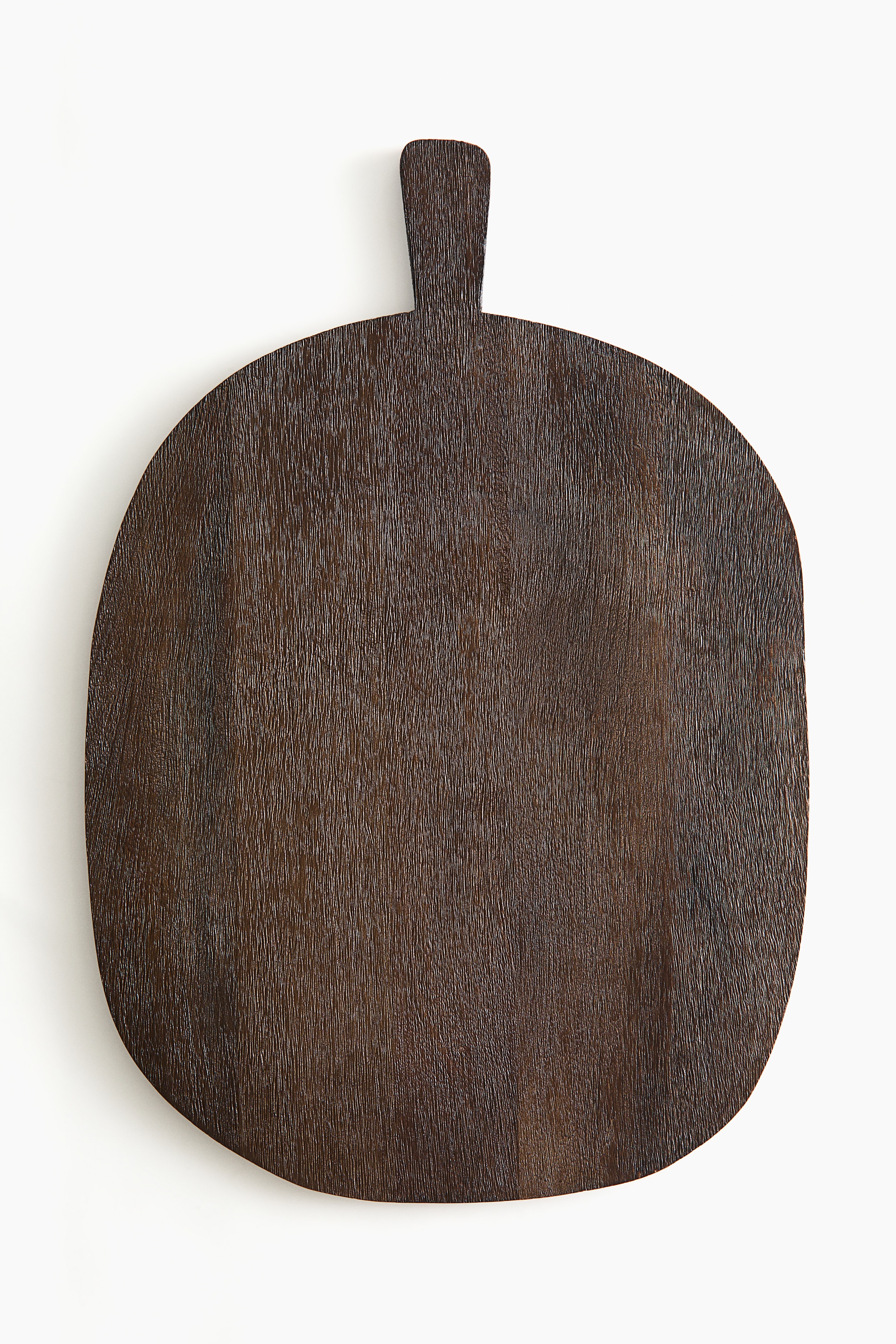 Large mango wood chopping board in the shape of a classic bread paddle with a small handle at the top. Width 33 cm. Length 46 cm.