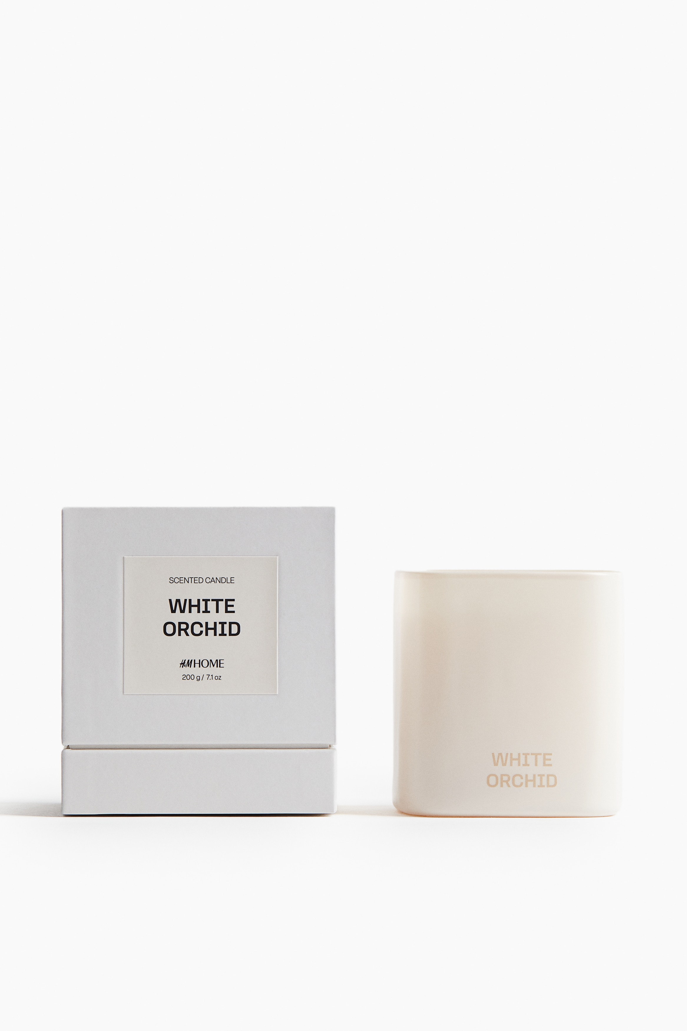 Scented candle made from coloured wax in a glass holder with a satin finish. Burn time 20 hours.
