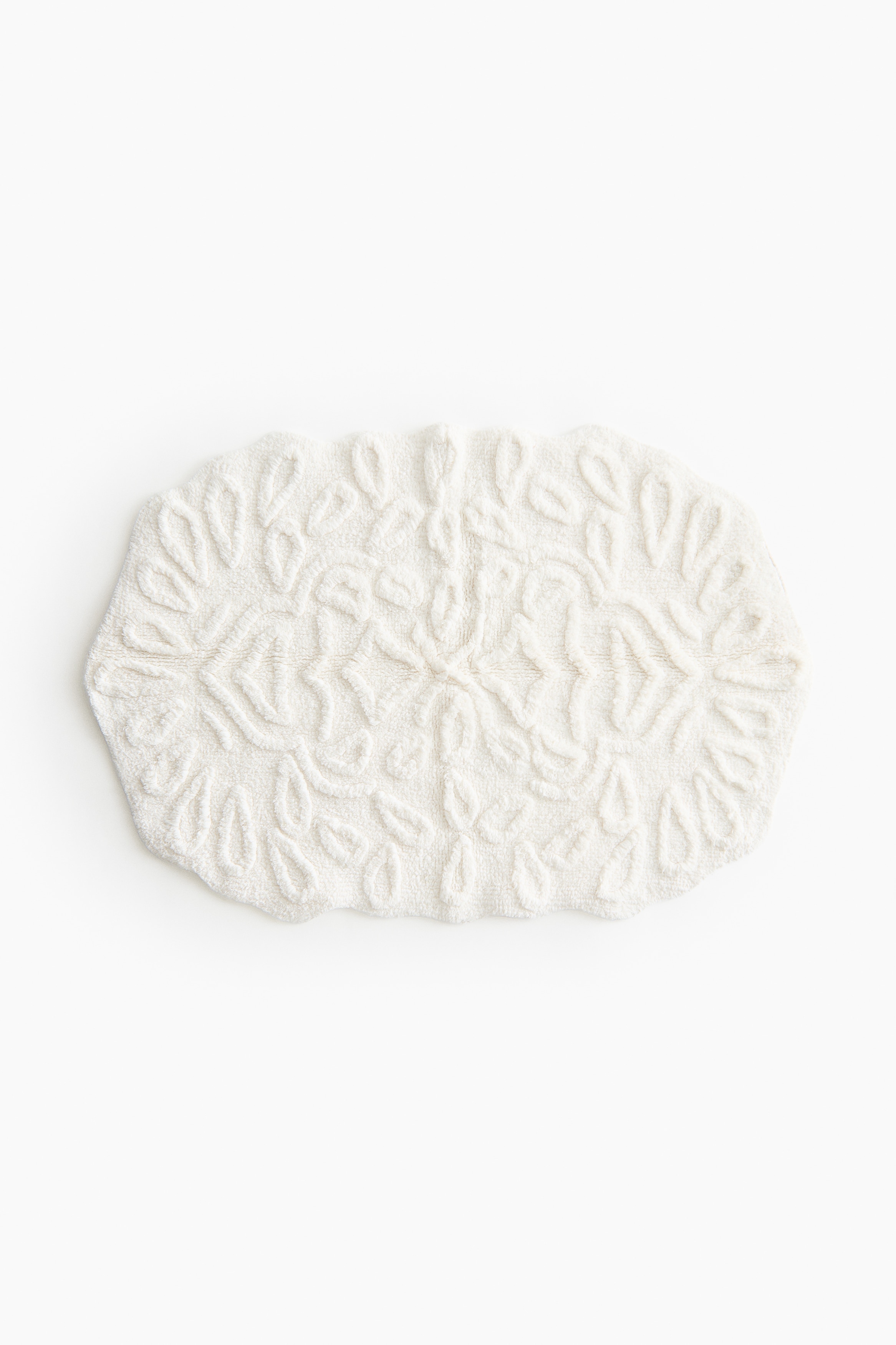Bath mat in a tufted cotton weave with a raised pattern and scalloped edges. Anti-slip protectors on the back.