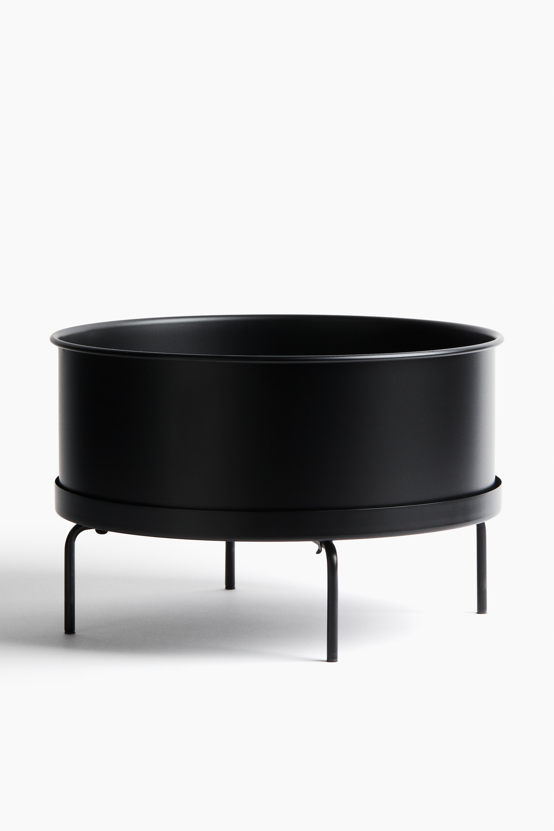 Wide plant pot in metal with a drainage hole in the bottom and a matching plant stand with a saucer. Dimensions pot: Height 16 cm. Diameter 40 cm. Dimensions stand: Height 10 cm. Diameter 41 cm.