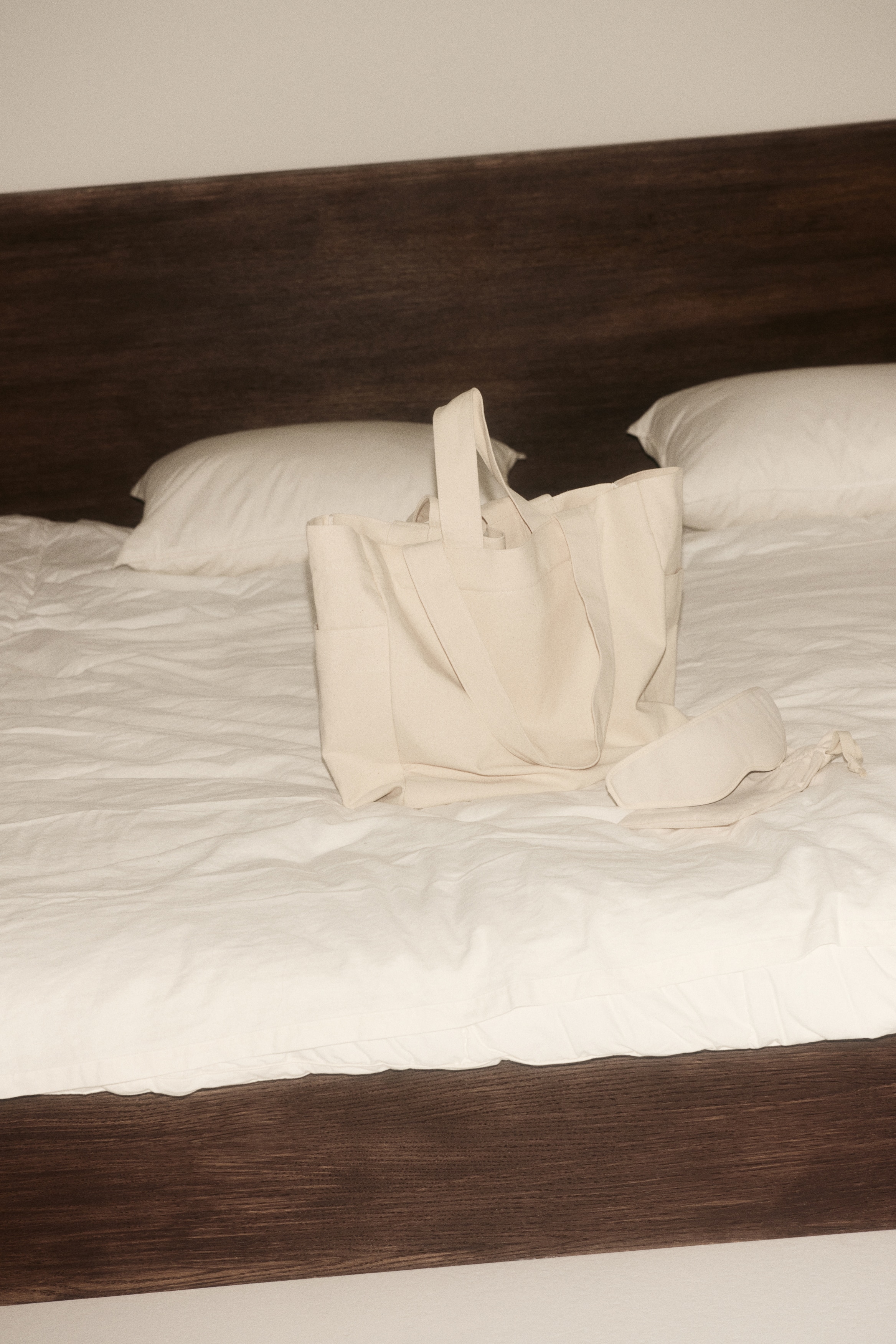 Sports bag in cotton canvas with two pairs of handles at the top, a small, zipped inner compartment and two open outer compartments, perfect for storing your water bottle. Unlined.