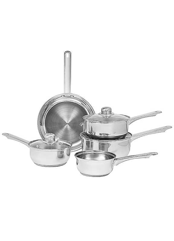The essential five-piece cookware set includes a milk pan, saucepans and a frying pan all in a tapered shape with a mirror polish.This cookware is dishwasher safe, has a two-year warranty and is suitable for use on induction hobs.Range: EssentialFurther InformationStainless Steel5pc Cookware SetMirror PolishTapered ShapeRiveted HandlesDishwasher Safe24cm Frying pan14cm Milk Pan - 0.75ltr Capacity16/18/20cm Saucepans - 1 / 1.5 / 2ltr CapacitiesSaucepans Have Glass Lids With An ActiveSteam VentSuitable For Use On Gas, Electric, Ceramic, Solid Hot Plate & Induction HobsStainless Steel