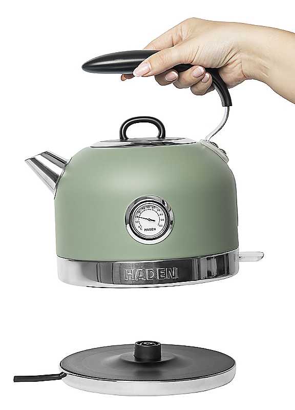Brighten up your morning with the Jersey range of modern retro kettle and toaster sets by Haden. Looking back to the traditional days of boiling water with a stovetop kettle, we have fashioned a modern kettle from the styling of the past.Named after Jersey, an independent and modern island with a historical story, its colourful past drew us to rectory red within this stunning range.- Perfectly shaped handle for an ergonomic grip and lift.- Comes with an extra removable limescale filter.- 1.5L capacity can make up to 6 cups of tea.- Convenient temperature gauge.- BPA Free water level indicator.- Rapid boil technology.- 360° rotational base.- ON/OFF switch indicator light.- Handy cord storage to keep worktops tidy.- Automatic shut-off and boil-dry protection for safety.- Premium coated stainless steel housing with chrome detailing.- 3000W/ 220-240V/ 50/60HzDimensions approx. 26H x 26W x 19D cm | stainless steel kettle, tea kettle, kettle with temperature control, green electric kettle, electric kettle 1.5L, water heater kettle, coffee kettle