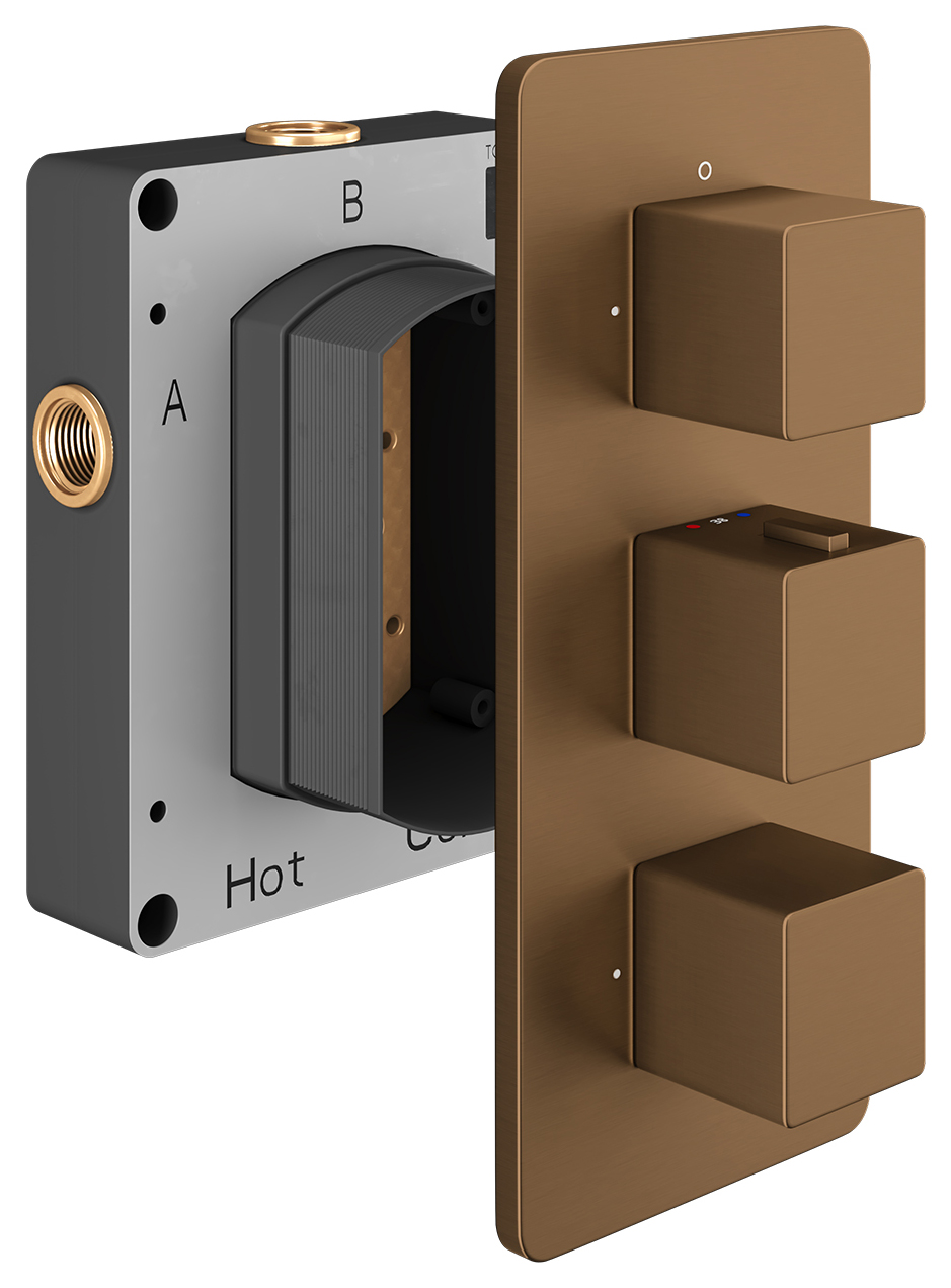 Hadleigh Concealed 3 Outlet Square Thermostatic Shower Valve - Brushed Bronze - Our range of concealed shower valves offer almost limitless potential in bathroom design, available in a variety of finishes and handle shapes, there is a solution for every bathroom. A concealed Valve in the shower or bath offers an ultramodern and user-friendly way of controlling your water, with the option of a vertical or horizontal fix our new concealed valve gives you the freedom of design.