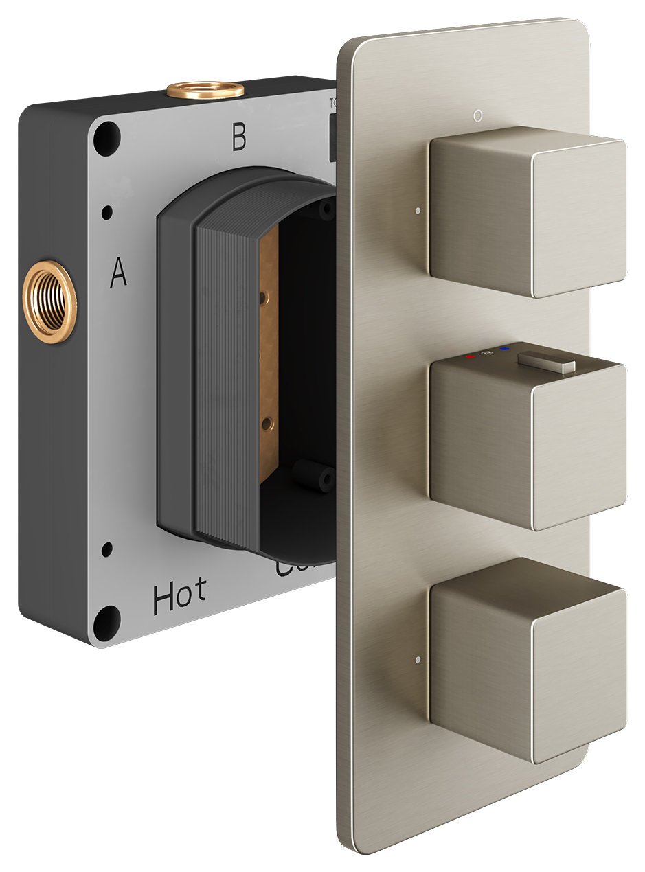 Hadleigh Concealed 3 Outlet Square Thermostatic Shower Valve - Brushed Nickel - Our range of concealed shower valves offer almost limitless potential in bathroom design, available in a variety of finishes and handle shapes, there is a solution for every bathroom. A concealed Valve in the shower or bath offers an ultramodern and user-friendly way of controlling your water, with the option of a vertical or horizontal fix our new concealed valve gives you the freedom of design.