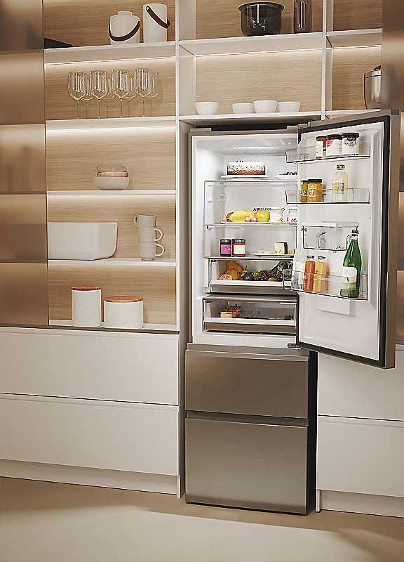 At 60cm wide, Haier's Three Doors 60 refrigerators boast an impressively engineered freezer drawer system that not only allows for a more efficient use of space for your frozen goods, it also ensures quick access to the entire freezer, saving up to 60% more energy compared to similar bottom mounted fridge-freezers. The Fresher Techs®, meanwhile, are constantly adjusting conditions to ensure the quality of your food is preserved. Haier's 3D 60 Series 5 refrigerators guarantee the perfect preservation of your food thanks to specialised zones that manage temperature and/or humidity to preserve your food for longer, as well as other cooling and preservation solutions. Haier's highly innovative Total No Frost technology cleverly prevents the formation of frost in your fridge-freezer. A special 'Fresher Shield' prevents warm air from entering your freezer during the continuous automatic defrosting process, protecting your frozen foods and preventing unnecessary energy loss. Now you'll never have to defrost your freezer again. Maintaining your fridge-freezer has never been so easy! Another 'think-outside-the-cold-box' innovation from Haier. Easy Access drawers not only give you quick & easy access to your frozen food, they also give you a vastly improved view of your freezer's contents compared to a regular hinged door. Moreover their ergonomic design prevents cold air escaping when the doors are open, reducing energy wastage by up to 60%.* *tested in real conditions and compared with similar Haier standard bottom mounted refrigerator-freezer. Brand: Haier Model Number - HTW5618EWMG Colour - Silver Integrated - No Freestanding - Yes Type - 3 door Fridge Freezer Capacity - 235/125 Litres Energy Rating* - E Noise Level dB* - 37dB Frost Free - Yes Temperature Control - Yes Number of Shelves (Fridge) - 3 + 2 drawers Adjustable Shelves (Fridge) - Yes Number of Compartments (Fridge) - 10 Number of Shelves (Freezer) - 2 Adjustable Shelves (Freezer) - No Open Door Alert - No Interior Light - Yes Requires Plumbing - No Dimensions - H 185cm x W 60cm x D 67 cm