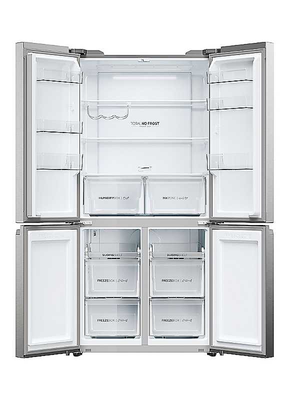The four-door Cube 90 refrigerator is available in a variety of finishes, each one as elegant as the next. At 90 cm wide, there are both 190cm and 200cm height models. The Cube 90 is also fitted with the best of Haier's revolutionary Fresher Techs®, our innovations that ensure your groceries are kept fresher for longer. Haier's Cube 90 Series 5 refrigerators guarantee the perfect preservation of your food thanks to specialized zones equipped with advanced technologies, and other dedicated zones to preserve your food longer.Model Number: HCR5919ENMP, Integrated: No, Freestanding: YesCapacity: 528L Total (Fridge 354L / Freezer 174L), Energy Rating: EEnergy Consumption: 329kWh, Noise Level: 38dB, Frost Free: YesTemperature Control: Yes, Number of shelves (Fridge): x3 shelvesNumber of Compartments (Fridge): x6 Door shelves, x1 Crisper, x1 Egg rackNumber of Compartments (Freezer): x4 Drawers, x1 Ice holder trayOpen Door Alert: No, Interior Light: Yes, Requires Plumbing: NoWarranty: Up to 5 years, Slim depth, Humidity ZoneTotal No Frost, Inverter CompressorTouch Display, Air Surround, Weight approx. 110kgDimensions approx. 190H x 90.8W x 64.8D cm