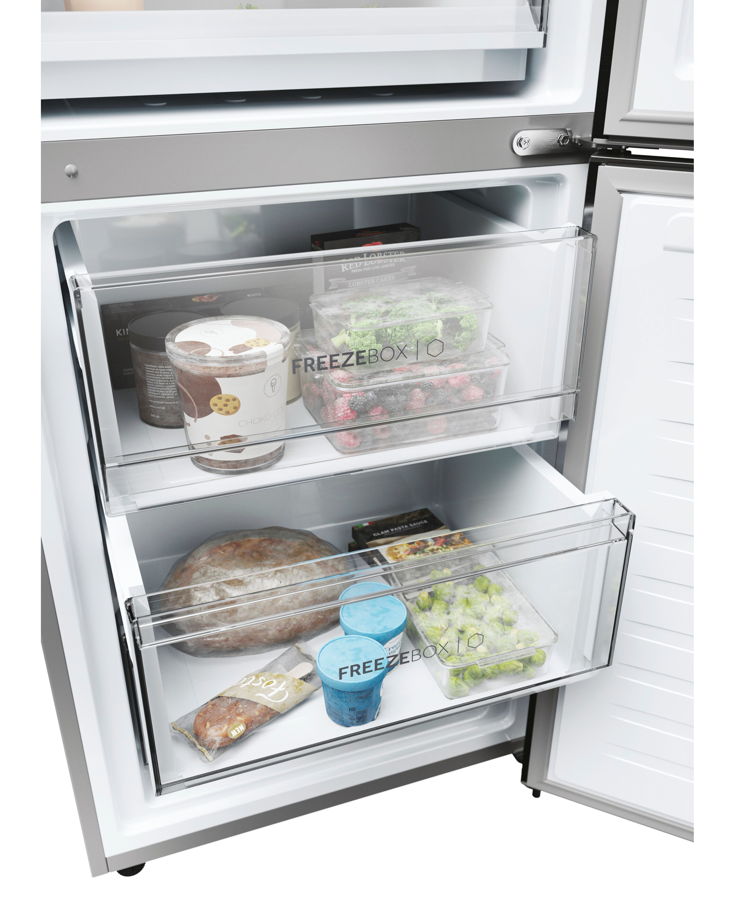 The HDPW3618DNPK Fridge Freezer combines modern aesthetics with state-of-the-art technology to enhance your kitchen experience. This freestanding appliance, featuring a 2-door design and finished in elegant Inox, provides both functionality and style. It boasts a significant capacity tailored for households that require extra storage, ensuring all your groceries are efficiently organised and preserved. Engineered with the innovative Air Surround technology, this fridge freezer maintains the long-lasting freshness of your groceries by distributing cool air evenly throughout. This prevents food from drying out, keeping it as crisp and delicious as the day you bought it. The Gently Air Flow feature further optimises cooling, preserving the taste and texture of your produce with precision. My Zone Pro elevates practicality by allowing you to customise temperature settings independently within specified compartments, thus catering to the unique requirements of various food items such as fresh fruit, vegetables, meat, and dairy products. Equipped with Haier Artificial Intelligence, the appliance is a smart addition to your home, offering a seamless experience through the hOn app. This connectivity feature empowers you to unlock innovative functions that predict your need for freshness, enhancing efficiency and convenience within your smart kitchen ecosystem. Maximise your storage needs with Haiers Bottom Mount 2D 60 PRO. This cleverly designed refrigerator offers a 60 cm width for additional capacity, perfect for stocking up or hosting gatherings. With innovative foldable shelves, it adapts effortlessly to your storage requirements, utilising every inch efficiently. Model: HDPW3618DNPK, Type: Freestanding, Colour: Inox, Energy Efficiency Class: D