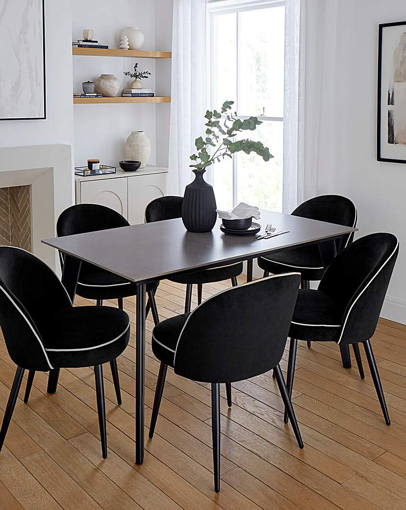 This package includes the Sintered Stone topped dining table and 6 Camille Dining chairs, Upholstered in a neutral velvet fabric with contrast black piping
