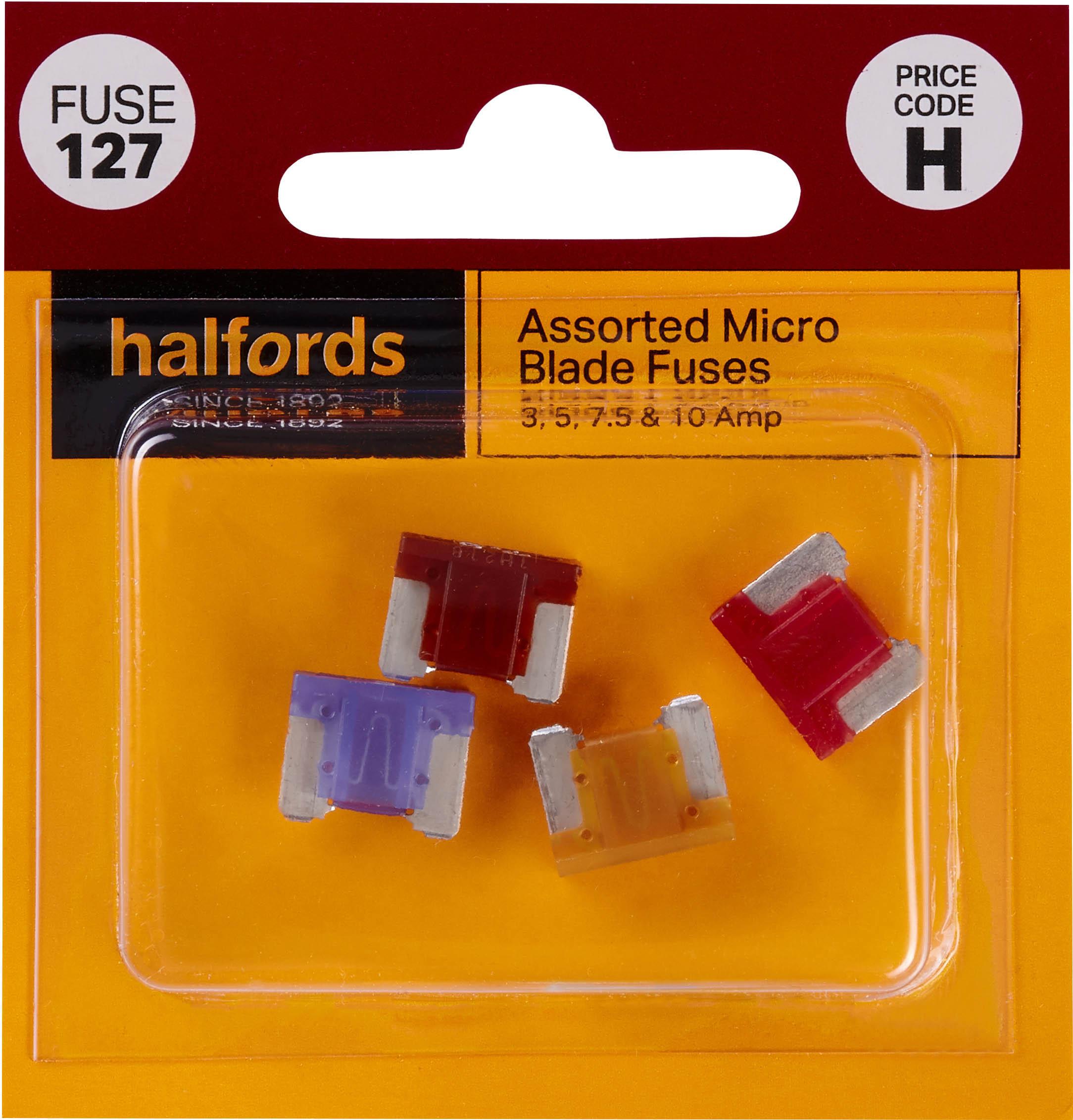 The Halfords Assorted Micro Fuses 3/5/7.5/10 Amp (FUSE127) pack contains an assortment of 4 fuses; 3/5/7.5/10 Amp, 12v 24v. All come as 10.8mm x 8.7mm.
