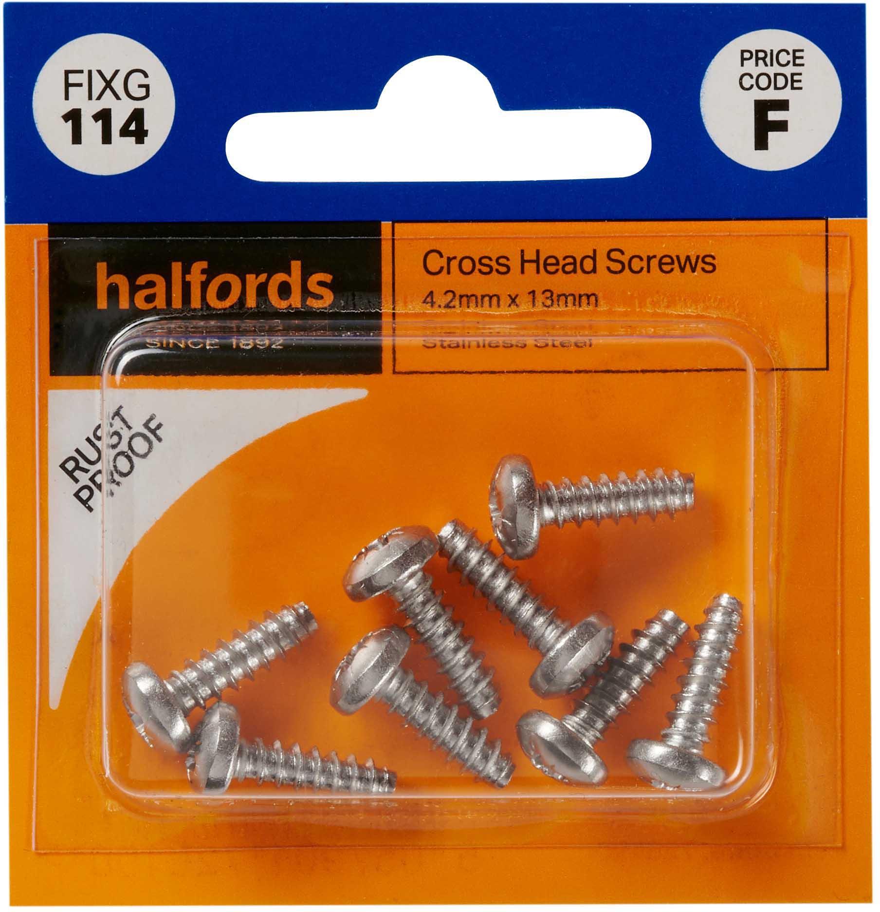 The Halfords Cross Head Screws (FIXG114) pack, contains 8 x 4.2mmx13mm cross head screws.