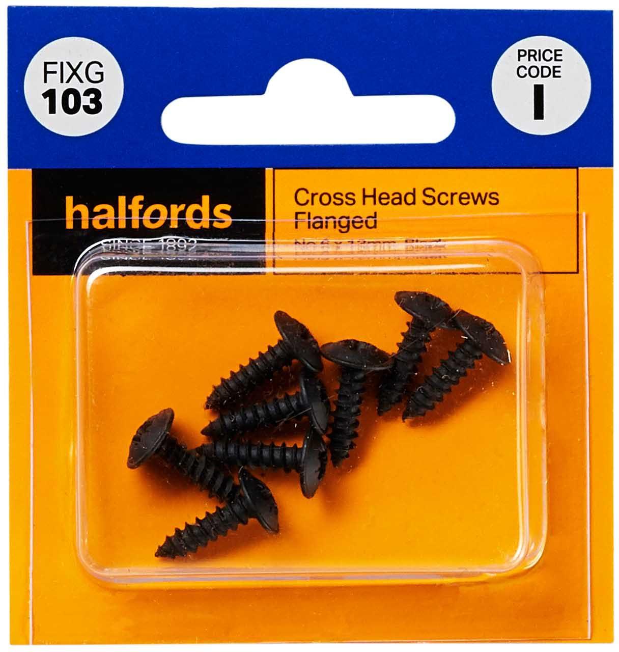 The Halfords Cross Head Screws Flanged (FIXG103) pack contains 8 x No. 6 x 13mm self tapping screws