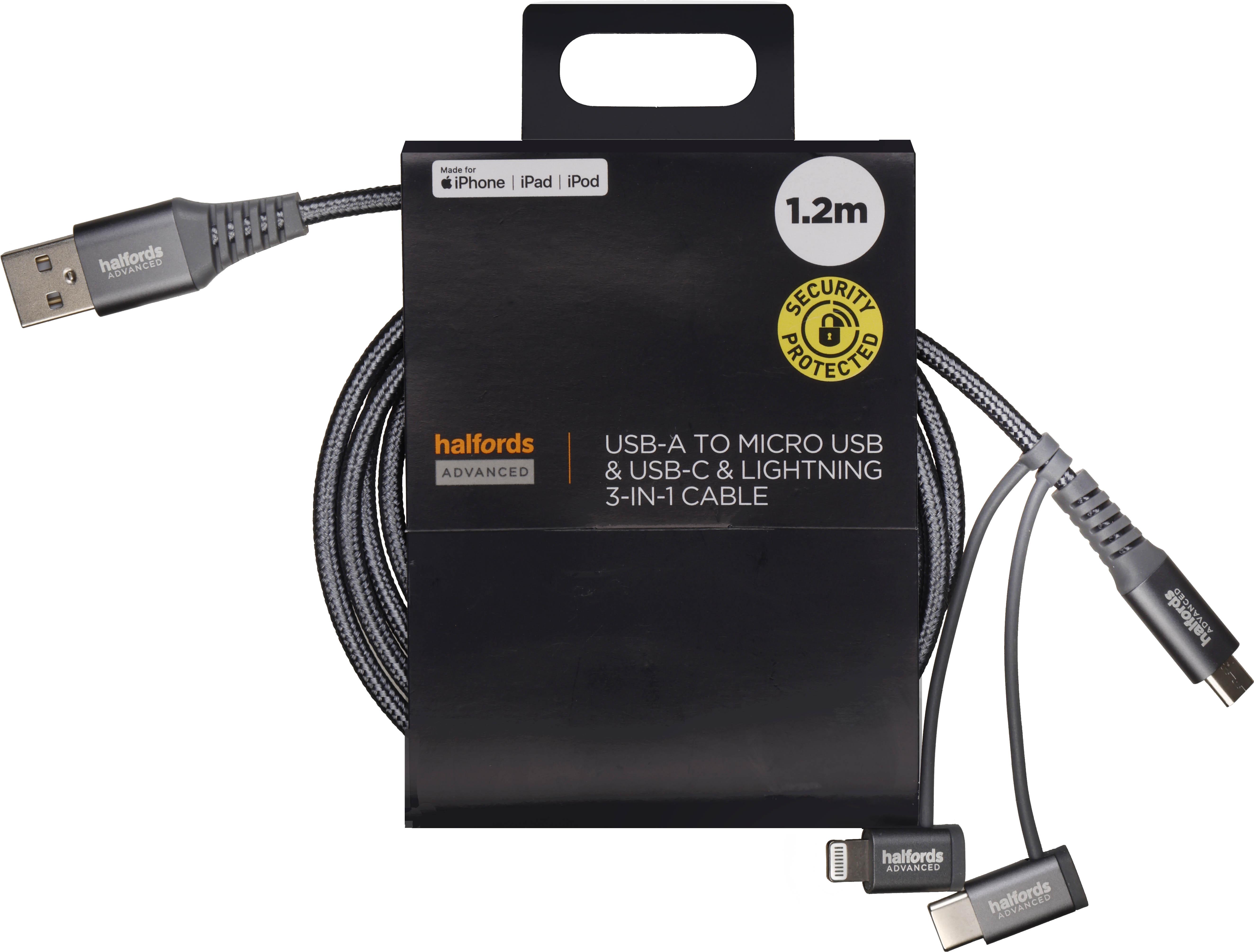 Halfords USB-A to USB-C & Lightning Cable 1.2m Charcoal