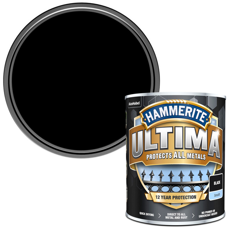 * Advanced anti-corrosion protection for up to 12 years * Extreme protection against harsh weather conditions and against UV rays * Easy to apply on all metals * No Primer or Undercoat needed * Suitable for exterior use | Hammerite Ultima Metal Paint Smooth 750ml in Black