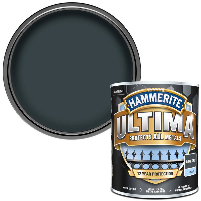* Advanced anti-corrosion protection for up to 12 years * Extreme protection against harsh weather conditions and against UV rays * Easy to apply on all metals * No Primer or Undercoat needed * Suitable for exterior use | Hammerite Ultima Metal Paint Smooth Dark 750ml in Grey