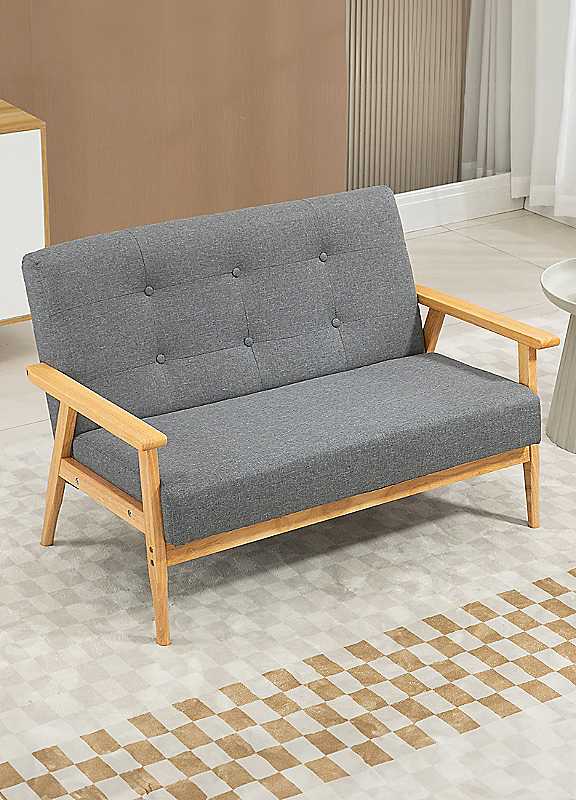 This stylish and contemporary sofa seamlessly combines retro charm with modern comfort, making it an ideal addition to any space. Crafted with a solid rubberwood frame, the chair offers long-lasting durability and stability, while its natural wood finish enhances its elegant appeal. The linen upholstery adds a soft and breathable touch, ensuring comfort while sitting. Designed with comfort in mind, both the seat and back cushions are filled with sponge padding, providing a plush seating experience. The button-tufted backrest adds a vintage flair, contributing to the sofa overall aesthetic. Whether used in your living room, home office, or as an accent piece, this armchair will elevate your decor.Maximum Load Capacity: 240 kgAssembly requiredLinen (100% Polyester), Sponge, RubberwoodOverall dimensions approx. 73Hx 115W x 66.5D cmSeat dimensions approx. 38H x 103W x 44D cmSeat cushion depth approx. 14 cmArmrest dimensions approx. 50Hx 6W x 59L cmBackrest dimensions approx. 41Hx 103W x 11D cmPlease remember to measure your available space before ordering. If using on an un-carpeted floor we recommend rubber or felt protection pads be used under the legs to avoid damage to your floors. | dark grey sofa, 2 seater sofa, comfortable sofa, upholstered sofa, wooden sofa