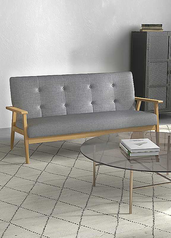 This contemporary sofa blends minimalism with retro charm, offering both style and comfort for any room. Crafted with a solid rubberwood frame, the chair promises exceptional durability and stability for long-lasting use. The natural finish of the wood enhances its elegant look, while the linen upholstery provides a soft, breathable surface that's gentle on the skin. Designed with comfort in mind, the seat and back cushions are filled with thick sponge padding, ensuring you can sit back and relax for hours. The button-tufted backrest adds a touch of vintage style, making this chair a perfect fit for living rooms, home offices, or any space that needs a stylish, comfortable seating option.Maximum Load Capacity: 240 kgAssembly requiredLinen (Polyester), Metal, FoamOverall dimensions approx. 73Hx 154.W x 69.5D cmSeat dimensions approx. 39.5H x 142.5W x 45.5D cm Seat cushion depth approx. 14 cmArmrest dimensions approx. 50Hx 6W x 59L cmBackrest dimensions approx. 41Hx 142.5W x 11D cmPlease remember to measure your available space before ordering. If using on an un-carpeted floor we recommend rubber or felt protection pads be used under the legs to avoid damage to your floors. | upholstered sofa, 3 seater wooden sofa, comfortable sofa, grey 3 seater sofa, wooden sofa