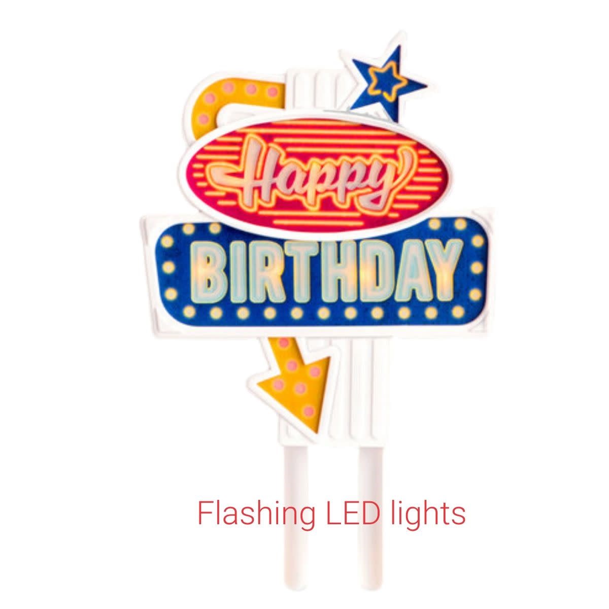 This Happy Birthday with flashing LED lights cake topper will complete that birthday cake in style.