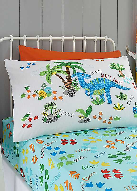 Go back to the dawn of dinosaurs with the cute fitted sheet & pair of pillowcases. Cool Tumble DryIron on low temperatureEasy care cotton blendOeko-Tex certified meaning the product has been tested and proven free of harmful levels of toxic substances.Machine Washable 30 degrees55% Polyester, 45% CottonPlease note: Pillowcases & Sheets are sold separately.