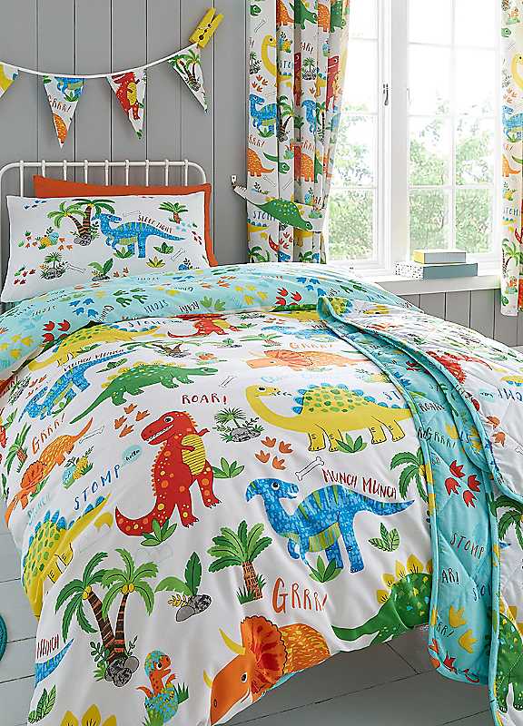 Go back to the dawn of dinosaurs with this cute duvet cover & pillowcase set. One pillowcase is included with the toddler and single set and two pillowcases with the double. Co-ordinate with matching accessories available separately to complete the look!Brand: Happy Linen Co.Cool Tumble DryIron on low temperatureEasy care cotton blendOeko-Tex certified meaning the product has been tested and proven free of harmful levels of toxic substances.Button fasteningMachine Washable 30 degrees55% Polyester, 45% Cotton