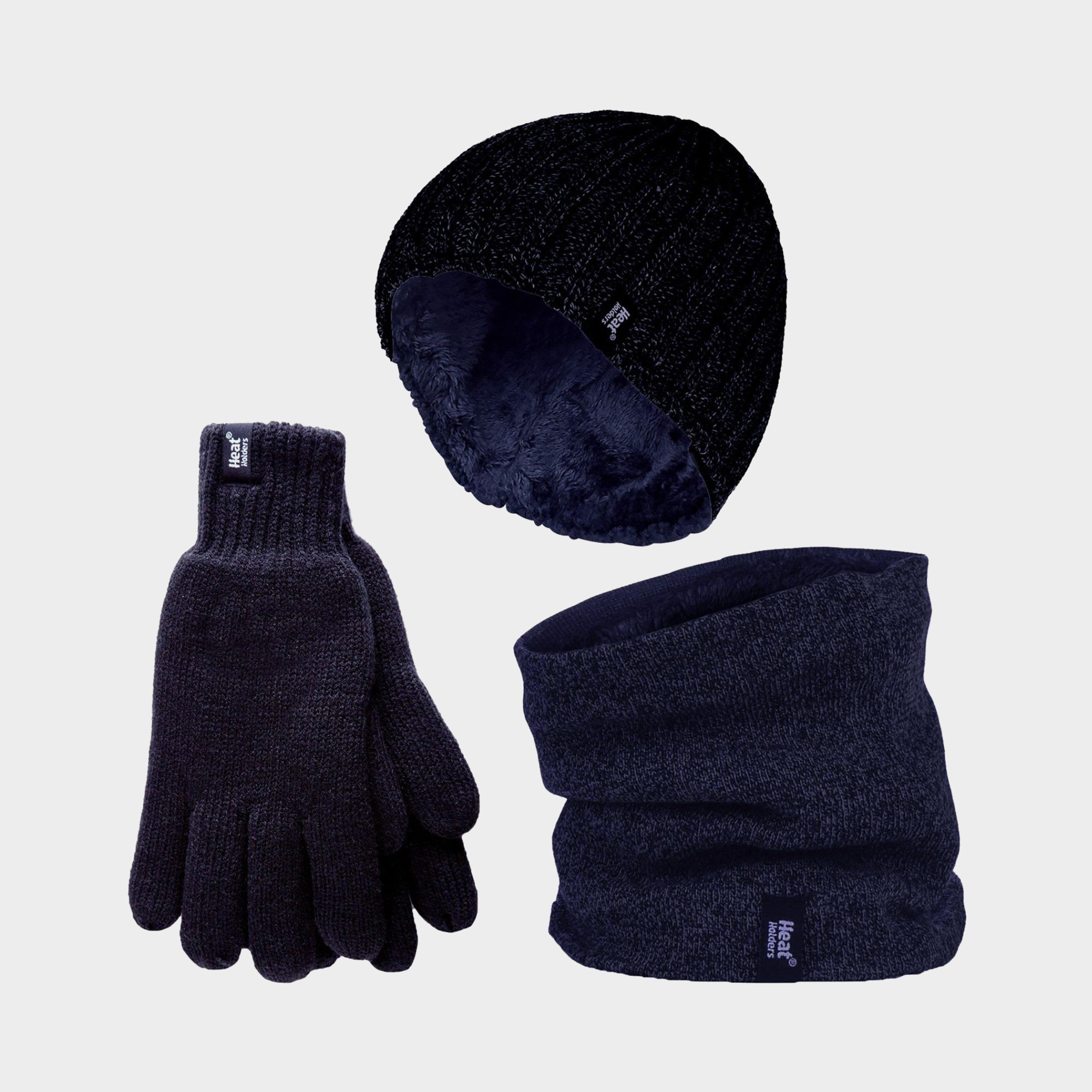 Heat Holders - Men's Hat, Gloves & Neck Warmer Set__This Men's chunky cable set is knitted in an attractive, soft marl two-coloured twist yarn with a ribbed hem and incorporates the latest Heatweaver thermal lining, a luxurious, plush fur-like insulating fabric, that maximises the amount of warm air held close to the skin. It also feels so soft and silky, These are bliss to pull on when the weather turns colder.__Here are the main reasons why we think this Heat Holders' Men's set is absolutely perfect for those Cold Winter months…__Heat Holders Men's Neck Warmer: A versatile and effective alternative to a scarf. __Heat Holders Men's Gloves: Heat Holders Gloves have a plush fur like thermal lining and Heat Holder's specially developed yarn to increase the amount of warm air that is held close to the skin. A Protective cuff is also added so that the wrist is hugged for a secure fit, extra warmth and all day comfort.__Available in 6 different colours: Black, Grey, Khaki, Navy, Burgundy & Brown. The Men's Gloves come in 2 Different sizes: M/L & L/XL, The Hats and Neck Warmers are both One Size. They are made from: Outer: 53% Polyester 47% Acrylic, Lining: 100% Polyester and are Machine Washable.__Extra Product Details__Heat Holders Men's Thermal Set_Comes With Hat, Gloves & Neck Warmer_Thick & Warm_Heat Holders Thermal Yarn_Plush Fur-Like Heatweaver Lining_6 Colour Options_Perfect For Winter