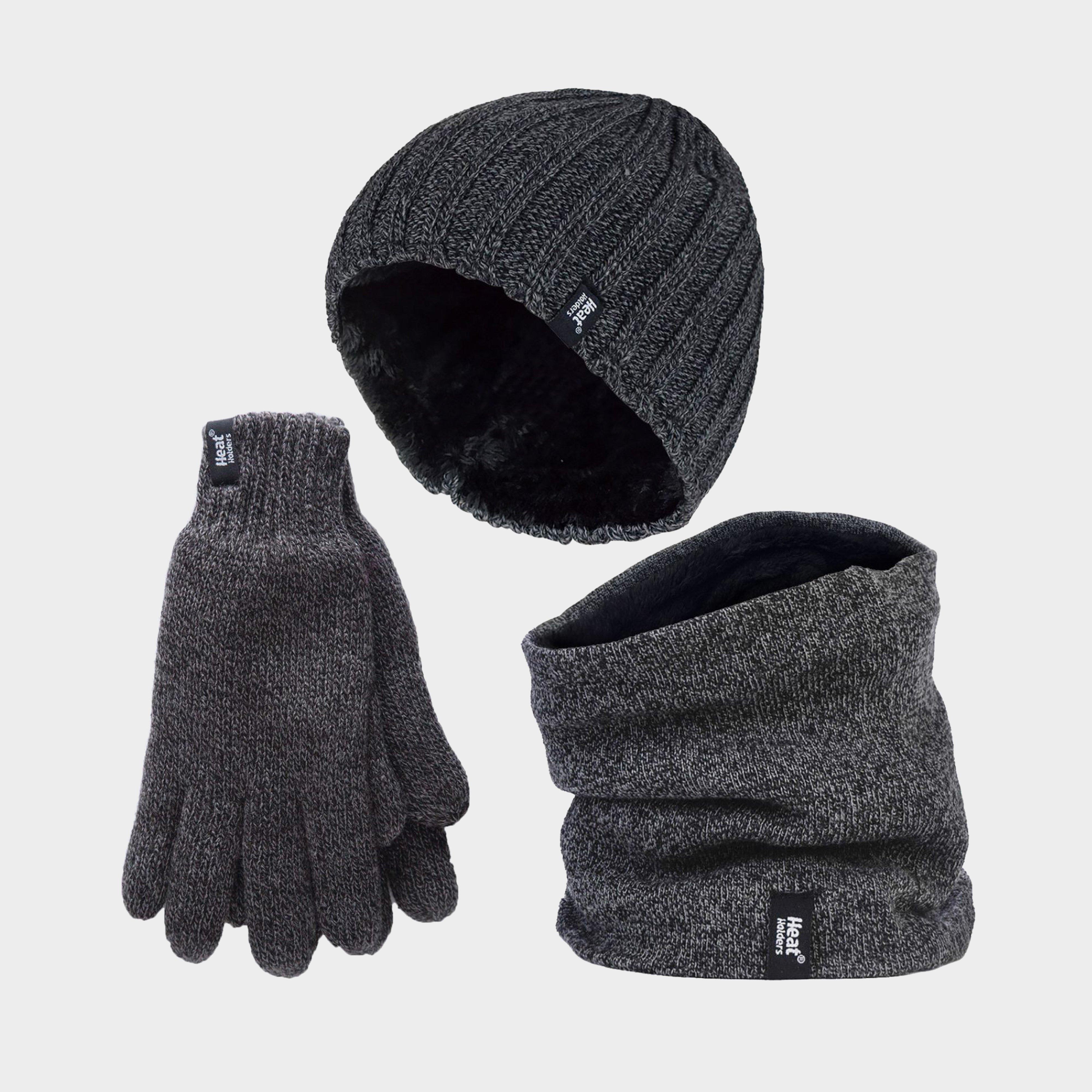 Heat Holders - Men's Hat, Gloves & Neck Warmer Set__This Men's chunky cable set is knitted in an attractive, soft marl two-coloured twist yarn with a ribbed hem and incorporates the latest Heatweaver thermal lining, a luxurious, plush fur-like insulating fabric, that maximises the amount of warm air held close to the skin. It also feels so soft and silky, These are bliss to pull on when the weather turns colder.__Here are the main reasons why we think this Heat Holders' Men's set is absolutely perfect for those Cold Winter months…__Heat Holders Men's Neck Warmer: A versatile and effective alternative to a scarf. __Heat Holders Men's Gloves: Heat Holders Gloves have a plush fur like thermal lining and Heat Holder's specially developed yarn to increase the amount of warm air that is held close to the skin. A Protective cuff is also added so that the wrist is hugged for a secure fit, extra warmth and all day comfort.__Available in 6 different colours: Black, Grey, Khaki, Navy, Burgundy & Brown. The Men's Gloves come in 2 Different sizes: M/L & L/XL, The Hats and Neck Warmers are both One Size. They are made from: Outer: 53% Polyester 47% Acrylic, Lining: 100% Polyester and are Machine Washable.__Extra Product Details__Heat Holders Men's Thermal Set_Comes With Hat, Gloves & Neck Warmer_Thick & Warm_Heat Holders Thermal Yarn_Plush Fur-Like Heatweaver Lining_6 Colour Options_Perfect For Winter