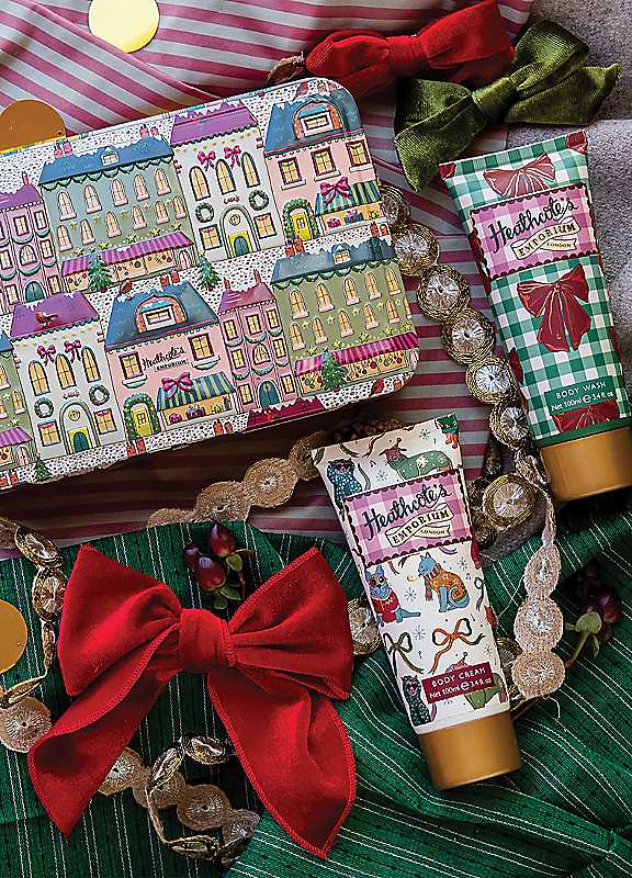 Delightful, embossed keepsake tin decorated with inviting shop windows ready for Christmas, neatly packed with two indulgent bath and body treats. A perfect beauty gift for her. Gentle body wash with tulip flower extract and rich hand and body cream formulated with softening shea butter, antioxidant vitamin E and hydrating pro-vitamin B5 make the perfect pampering pair. Both are scented with calming eucalyptus, lavender and patchouli essential oils, notes of fresh green leaves, delicate lily of the valley and warm sandalwood. Welcome to Heathcote's Emporium inspired by Christmas shopping. Body wash decorated with hand painted red bows and Christmas gingham sits alongside the body cream with festive cats and dogs dressed in favourite Christmas jumpers festooned with bows.Cautions: Use only as directed. In the event of contact with the eyes, rinse with clean water. Discontinue use if irritation occurs.