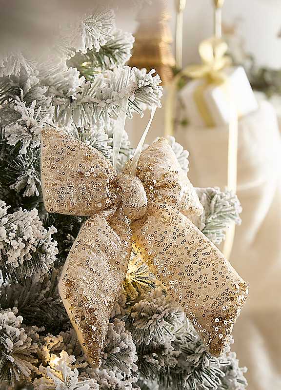 Add some glitter and glamour to your Christmas decorations this year with this gold sequin hanging bow. This fabric bow is adorned with gold glitter sequins. It comes with a handy hanging loop for you to place it on your tree or even door handles. Gold sequin fabric bow Dimensions: 25 x 20 x 5 cm | sequin christmas ornaments, christmas bow decorations, gold christmas ornaments, christmas tree decor, christmas bow ornaments, christmas tree bow, hanging christmas decorations, bow ornaments, gold christmas decor