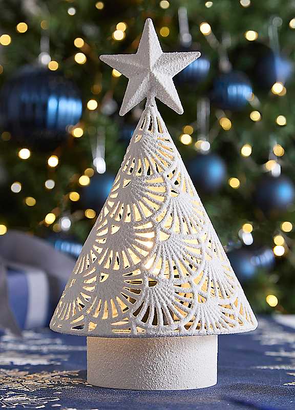 This white metal Christmas tree with light up any room. The tree is covered in a flocked effect, giving it a real snow-like finish. Simply place in your home and turn on to see the light shine through the cut-out details. Battery operatedRequires 2 x AA batteries (not included)Dimensions: 26 x 14.5 x 14.5 cm