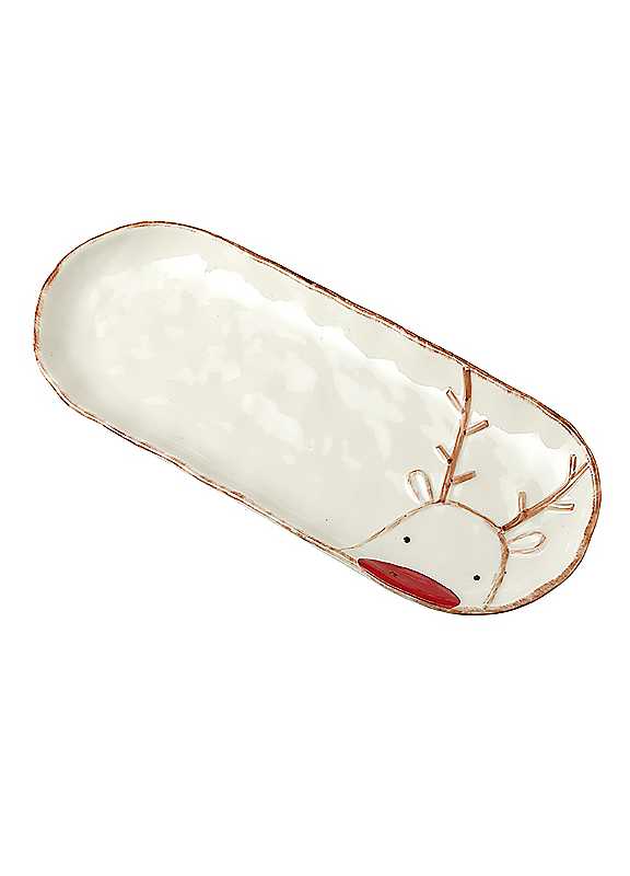 Cream Stoneware rectangular Rudolph plate - perfect for mince pies.100% StonewareDimensions approx. 30 x 11.5 x 2.5 cm