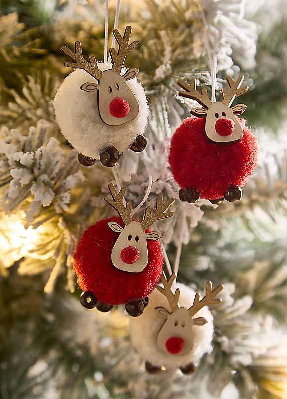 Set of 4 pom pom reindeer baubles. This set of 4 baubles consist of 2 red and 2 neutral pom pom baubles, each with their own wooden reindeer face. These fun baubles are perfect for hanging on smaller table top trees, or even on a child's tree. Set of 4: 2 x red, 2 x neutral Each bauble dia: 9 cm