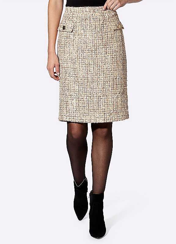 Boucl© skirt with integrated sequins, high waistline and pencil skirt design, perfect for adding a touch of elegance to any outfit. Featuring a waistband with darts and decorative flap pockets, as well as a rear zip and vent for added comfort and movement. This Heritage Weave Pencil Skirt is a must-have for any fashion-forward individual looking for a printed design statement piece to elevate their wardrobe.Machine washableOuter: 90% Polyester, 10% AcrylicLining: 100% PolyesterLength approx. 56 cmPlease Note: European sizing tends to run smaller than UK. We suggest sizing up for the perfect fit!