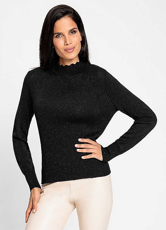 This ribbed ruffle neck jumper is a must-have for your wardrobe. Made from soft, fine ribbed knit with glittery decorative yarn, it features a high neckline and long sleeves with ribbed cuffs. The stand-up collar has an elegant wavy edge, adding a touch of sophistication to this versatile piece. Slightly sheer and available in one chic plain design, this jumper can be dressed up or down for any occasion. Elevate your style with this stylish and comfortable jumper.Machine washable42% Cotton, 34% Viscose, 16% Polyester, 8% Metallised FibresLength approx. 62 cmPlease Note: European sizing tends to run smaller than UK. We suggest sizing up for the perfect fit!