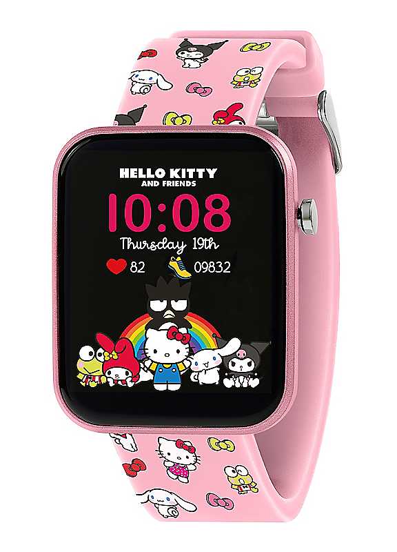 Hello Kitty and Friends Kids' Smart Watch. Bring a little cuteness to every day with this Hello Kitty and Friends smart watch! With a colourful digital display and charming Hello Kitty and Friends-themed dials, kids can check the time, track activity, monitor steps, sleep, and set alarms - all alongside their favourite characters. The soft pink strap features Hello Kitty, My Melody, Badtz-Maru, and more in a playful all-over design.Features:Official Hello Kitty and Friends smart watchFull-colour digital display withHello Kitty and Friends dialsComfortable, adjustable silicone strapA must-have gift for any Sanrio fan who loves style, fun, and functionality!Full-colour digital display with fun Snoopy-themed dials, Easily check the time, track activity, monitor steps and sleep, and set alarms. Soft white strap features a playful all-over Snoopy design in a black.Age suitability: 6+ yearsSterling Silver | smart watch for girls, pink digital watch, smart led watch, cute digital watches, pink childrens watch, digital smart watch, smart watch strap, pink smart watch, stylish digital watches, childrens digital watch, kids smart watch