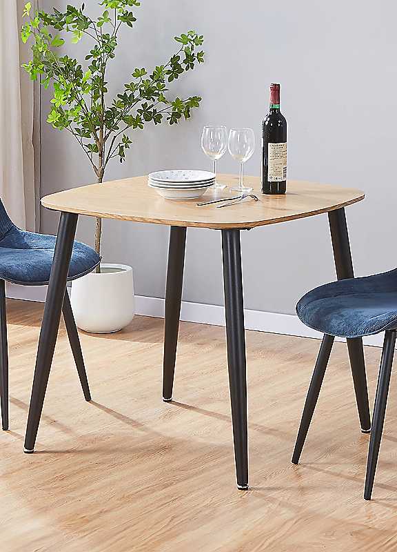 This compact oak effect square dining table features a gently tapered shape and soft edge design. The tabletop is firmly fixed to each leg which is made from tapered tubular steel with a black matt paint and built in adjusters for uneven floors. Can comfortably seat 2 or even 4 depending on your chair selection. Seats 2 or 4 Minimal assembly required Wipe clean with a damp cloth MDF table top with metal legs Please remember to measure your available space before ordering. If using on an un-carpeted floor we recommend rubber or felt protection pads be used under the legs to avoid damage to your floors. For Assembly Instructions click here