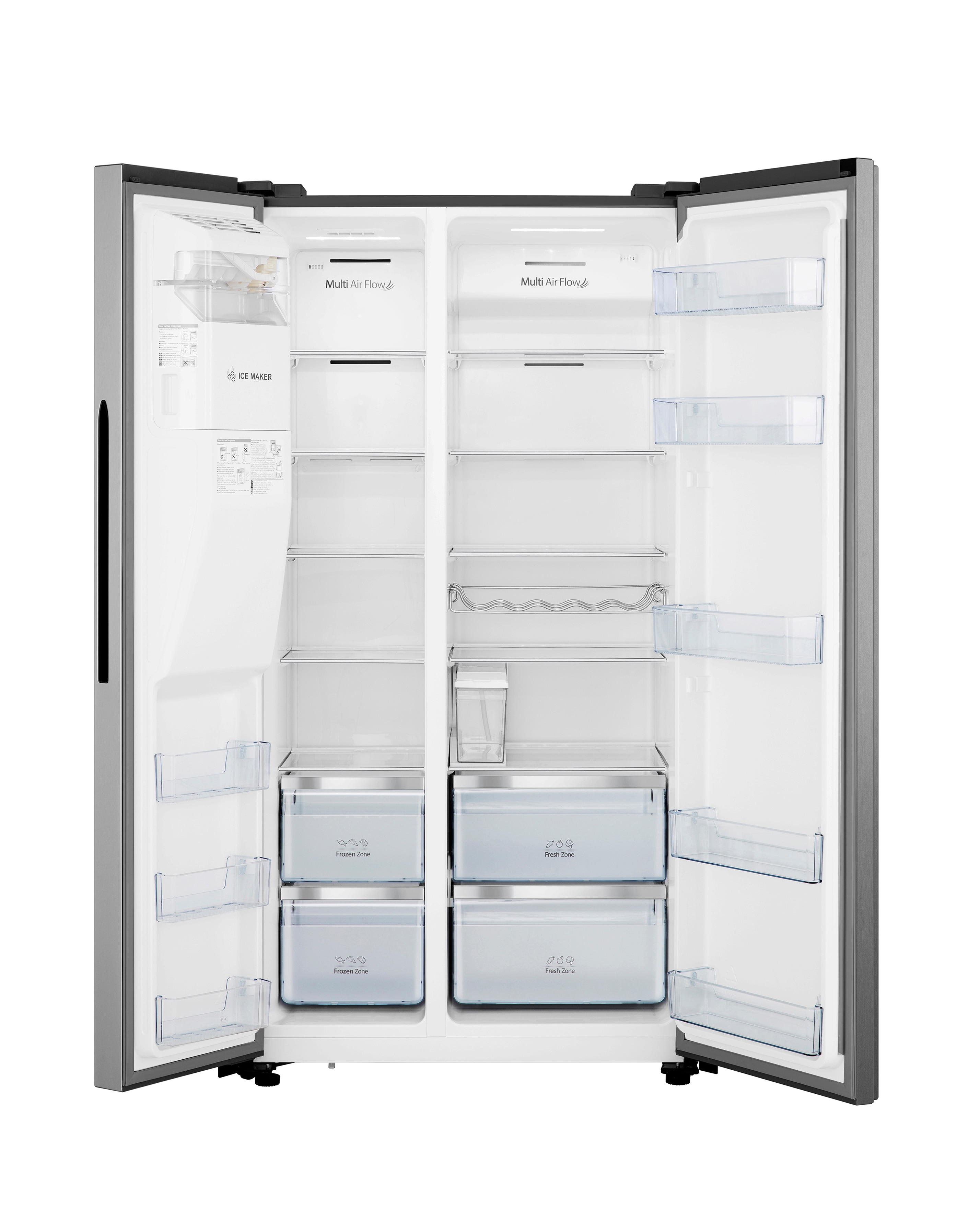 Iconic American style,the latest in PureFlat design. Now boasting a sleek PureFlat door design, the RS694N4TIE offers an XL capacity to store your weekly shop with ease (up to 535 litres) and with a built-in non-plumbed water & ice dispenser on the front, enjoy freshly chilled water, cubed or crushed ice in an instant to keep your drinks cool. Inside, it comes packed with the latest cooling technologies such as Total No Frost with Multi Air Flow which means there's no need to manually defrost, and an advanced inverter compressor that offers more power, greater energy-efficiency, and less noise.