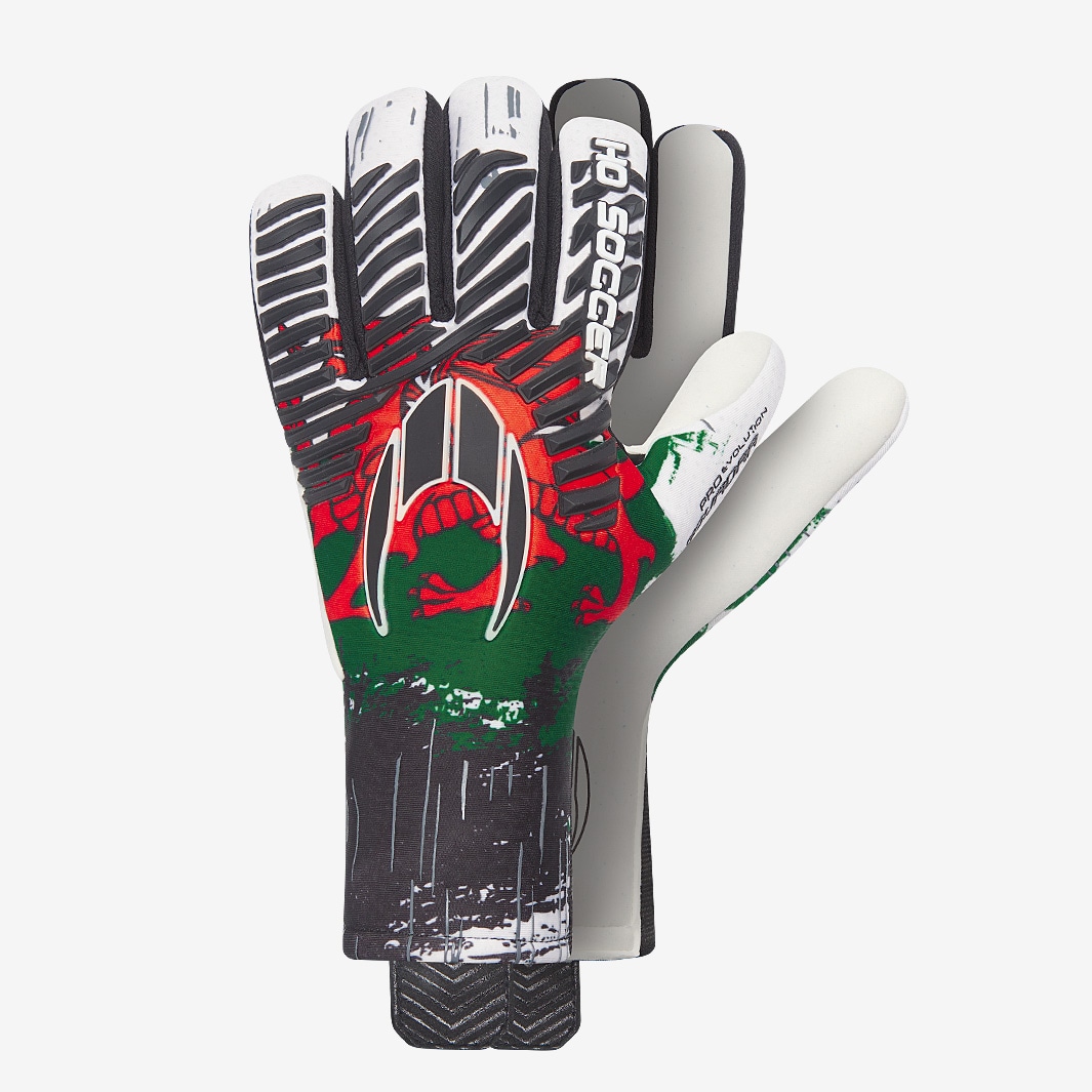 Rep your favourite nation with HO Kids Pro Evolution Squadra x Wales goalkeeper gloves in WhiteRedGreen, a special tournament edition with exclusive graphics in Wales colours. Sleek, stylish, and ready to perform, the Pro Evolution Squadra is an elitelevel glove designed to meet the standards of professional keepers.It uses the tightfitting negative cut thats so popular with the pros, while fully extended palm latex goes all the way to the wrist for maximum surface contact and ball control. The latex is HOs SHIELD formula, offering reliable grip and improved durability on artificial pitches.On the backhand, the ERGO 3D GEL system bolsters the punching zone to add distance to your clearances and make sure you connect cleanly.At the wrist, the strapless construction is elasticated for a secure feel, and theres a pull tab on the palm side for easy adjustment. Cut Negative with wrap over thumb and outer side of the hand palm extends to the wrist for greater contact surface with the ball Palm 5mm SHIELD latex + 3mm foam formulation provides up to 50 more durability on artificial ground Backhand ERGO 3D GEL system very light and ergonomically constructed, with special attention to the punch area Body LightTC Fleece provides lightness and comfort Wrist Closure Strapless double elastic construction area located on the sides of the wrist, which perfectly adjusts this special model without a closure strap