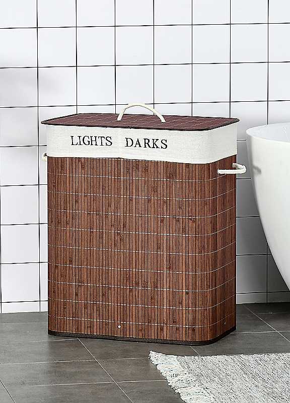 Keep dirty clothes stored in an easy and efficient way - with this laundry basket from HOMCOM. There are two sections - a 'light' and a 'dark' - meaning fewer mix-ups when washing and fewer clothes ruined. The shell is made from natural bamboo, so it's lightweight and naturally resistant to moisture. Perfect for bathrooms and kitchens. Comes complete with a handle on the lid and side, making it easy to carry around.Dimensions approx. 63H x 32W x 52D cm