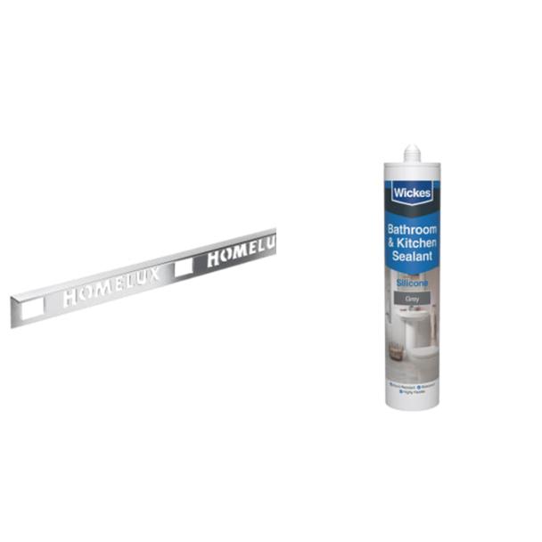 Homelux 12 5mm Metal Straight Silver Tile Trim 2 44m + Wickes Grey Kitchen Bathroom Silicone Sealant 300ml