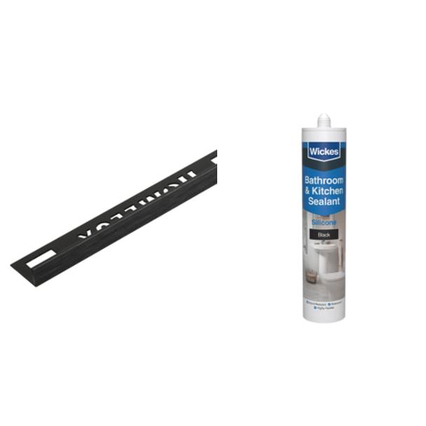 Homelux 8mm Metal Straight Brushed Black Tile Trim 2 44m + Wickes Black Kitchen Bathroom Silicone Sealant 300ml