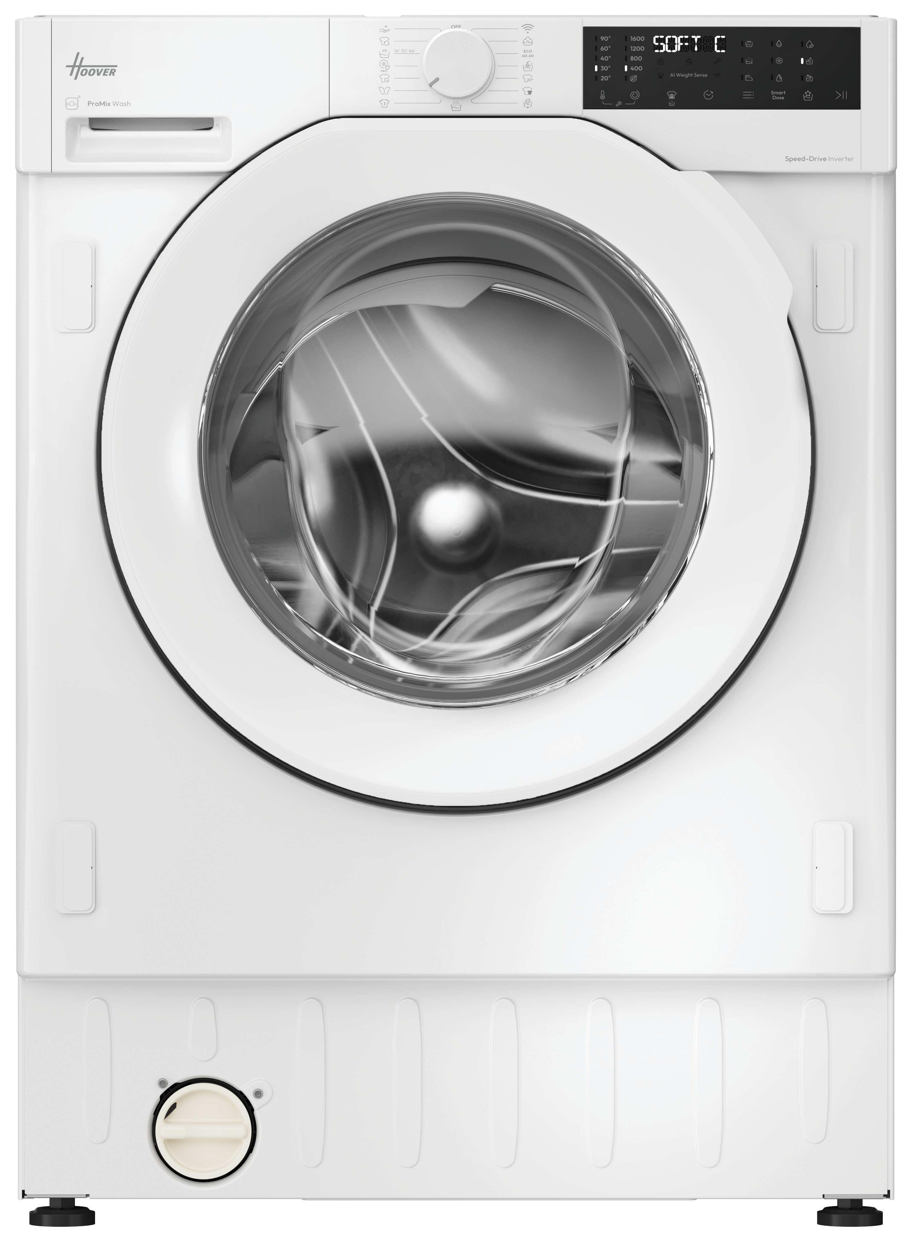 Hoover BH4S49M6D9J-80 Integrated Washing Machine - White - The Hoover H-Wash 400 Built-In delivers an exceptional washing experience with its sleek new design and user-friendly smart display. Equipped with AI Weight Sense, it automatically adjusts the cycle to match the load for optimal performance. The ProMix System ensures even detergent distribution, while the hOn app offers remote control and access to advanced features. With up to 8 care cycles, it caters to all your laundry needs with ease and precision.