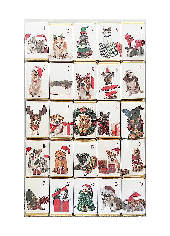 Twenty-five individually wrapped milk chocolate slims featuring an array of adorable cats and dogs in festive hats! Perfect for counting down the days until Christmas!For ingredients information click here