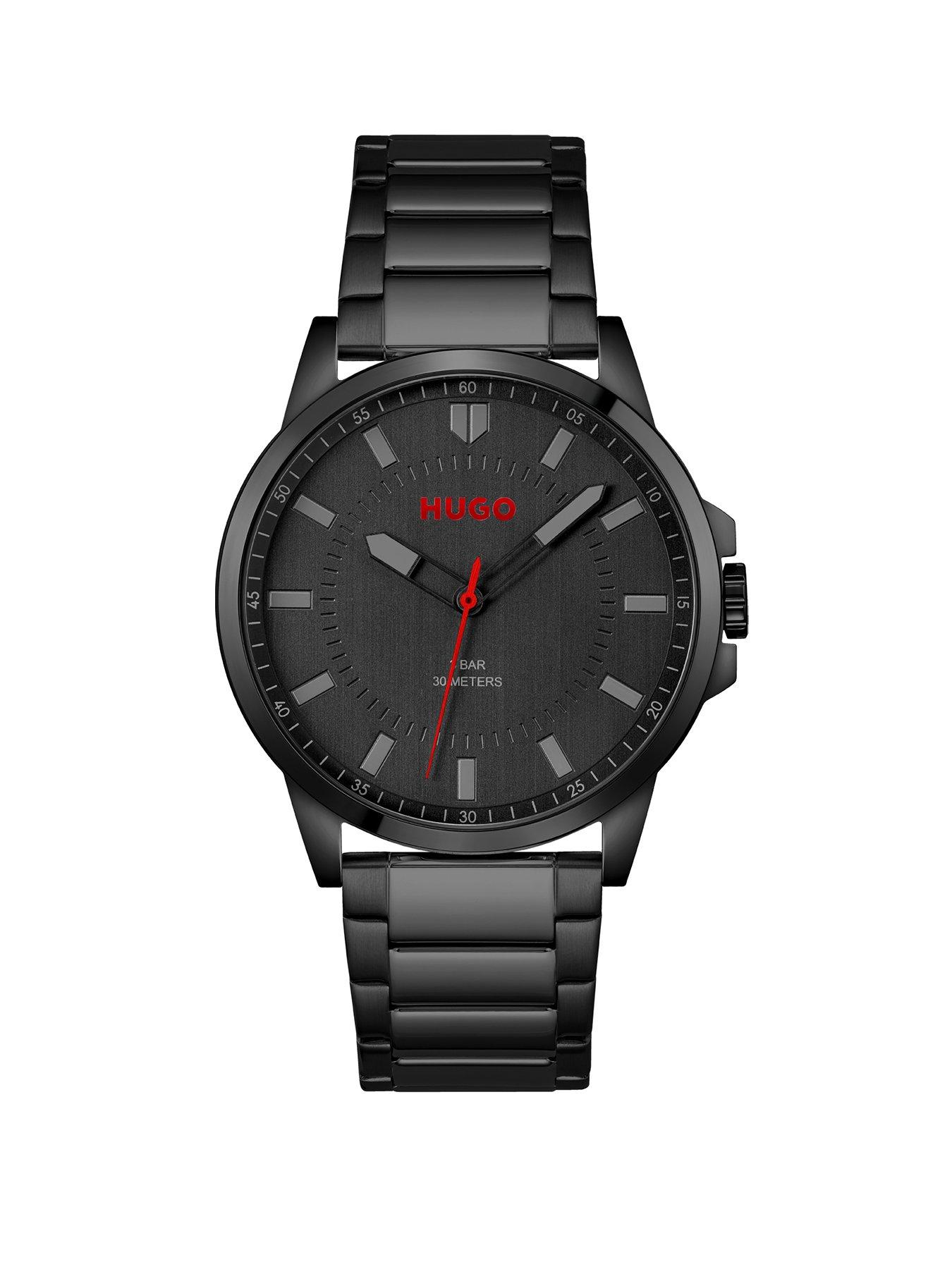HUGO #First Men's Watch Black HUGO gents watch from the #FIRST family. Features 43mm black IP stainless steel case, black dial with red details and black IP stainless steel bracelet. Water resistant to 3ATM 24Hr Display: N Case Diameter (in cm): 4.3 Case height (in cm): .9 Case Length (in cm): 4.3 Case Shape: Round Case Width (in cm): 4.3 Fastening Type: Bracelet Glass: Mineral Movement: JapaneseQuartz(battery) Strap Material: Stainless Steel Water Resistant: Y