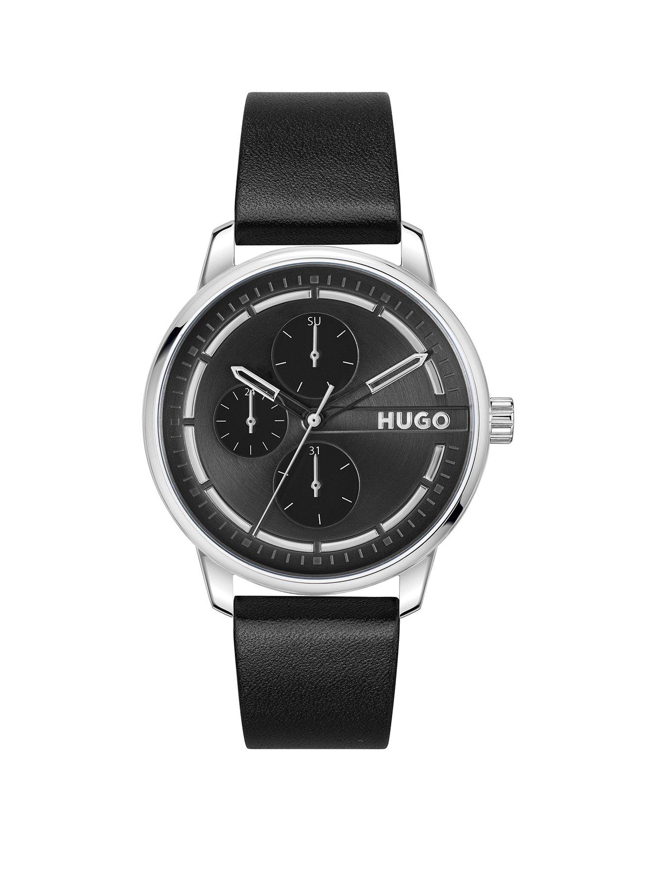 Hugo Gents Hugo #Stamp Multi Black Leather Strap Watch Hugo Gents Multifunction Watch From The #Stamp Multi Family. Featuring A 44Mm Stainless Steel Case, Black Dial, Black Leather Strap And Hugo Buckle. Water Resistant To 3Atm 24Hr Display: N Case Diameter (In Cm): 4.4 Case Height (In Cm): 1 Case Length (In Cm): 4.4 Case Shape: Round Case Width (In Cm): 4.4 Fastening Type: Strap Buckle Glass: Mineral Movement: Japanese Quartz (Battery) Strap Material: Leather Water Resistant: N