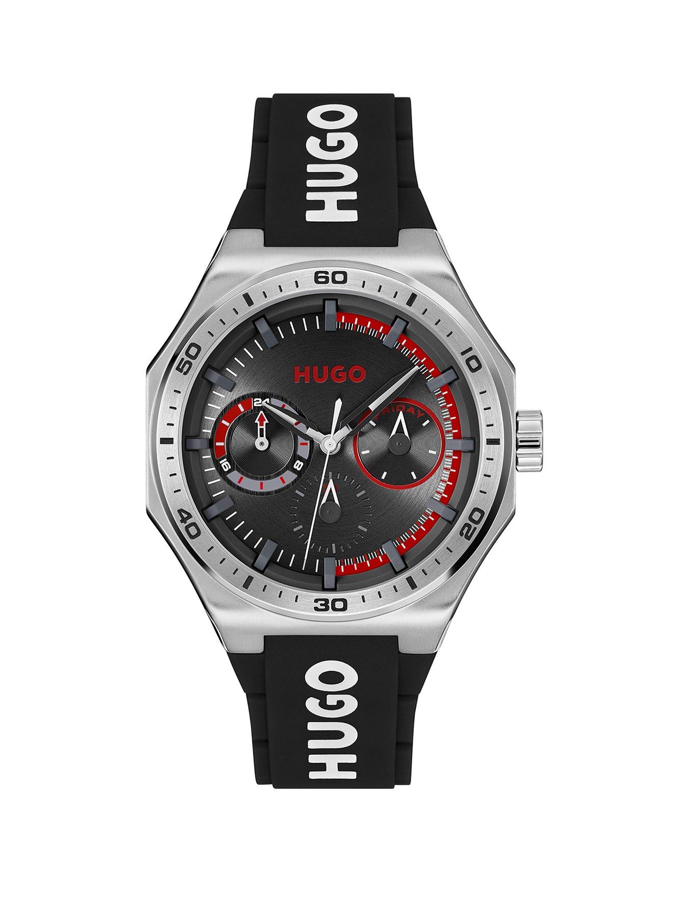 HUGO #Grail Sport Men's Watch Black HUGO gents multifunction watch from the #GRAIL SPORT MULTI family. Featuring a 44mm stainless steel case, black dial, black leather strap. Water resistant to 5 ATM. 24Hr Display: N Case Diameter (in cm): 4.4 Case height (in cm): 1.1 Case Length (in cm): 4.4 Case Shape: Round Case Width (in cm): 4.4 Fastening Type: Strap Buckle Glass: Mineral Movement: JapaneseQuartz(battery) Strap Material: Silicone Water Resistant: Y